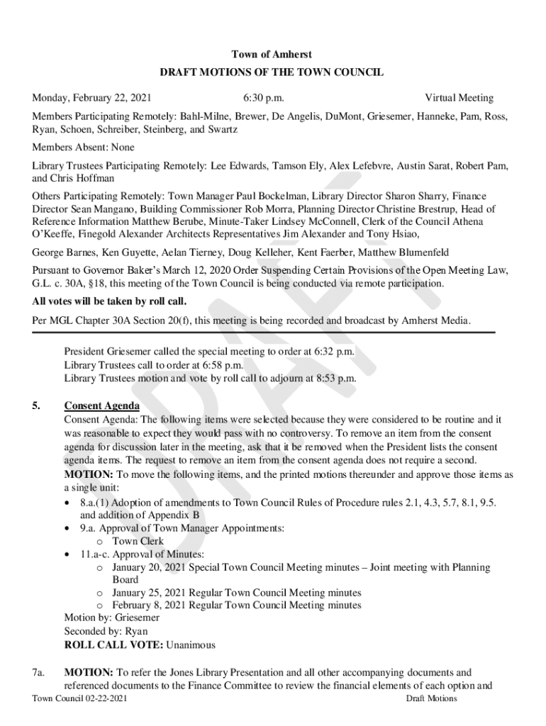 Town of Amherst DRAFT MOTIONS OF THE TOWN COUNCIL Monday, February 22, 20216:30 p.m. Virtual MeetingMembers Participating Remotely: Bahamian, Brewer, De Angeles, DuMont, Gruesomer, Banneker, Pam,