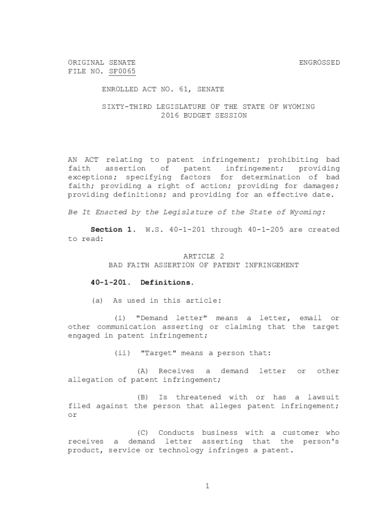 ORIGINAL SENATE FILE NO. SF0065ENGROSSEDENROLLED ACT NO. 61, SENATE SIXTYTHIRD LEGISLATURE OF THE STATE OF WYOMING 2016 BUDGET SESSION AN ACT relating to patent infringement; prohibiting bad faith