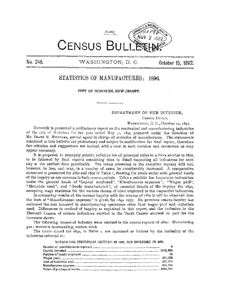 Get the free Bulletin 245. Statistics of Manufactures. City of Hoboken, New Jersey.. Census Bulle...