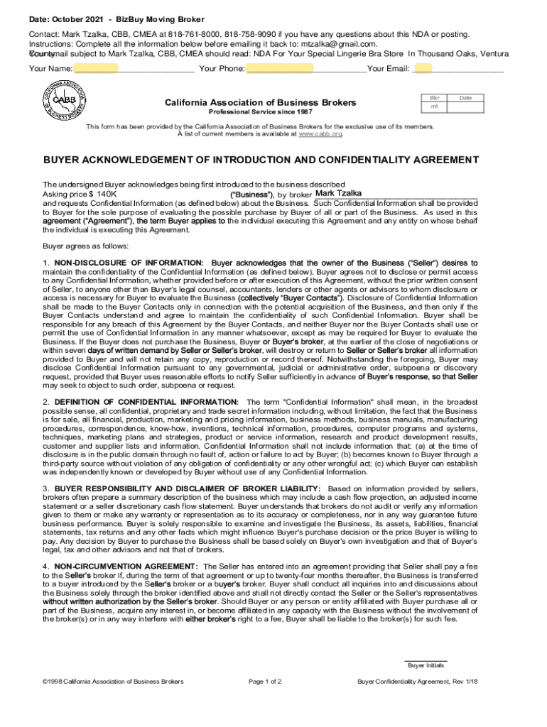 Date: October 2021 Bixby Moving Broker Contact: Mark Talk, CBB, CMEA at 8187618000, 8187589090 if you have any questions about this NDA or posting. Instructions: Complete all the information below