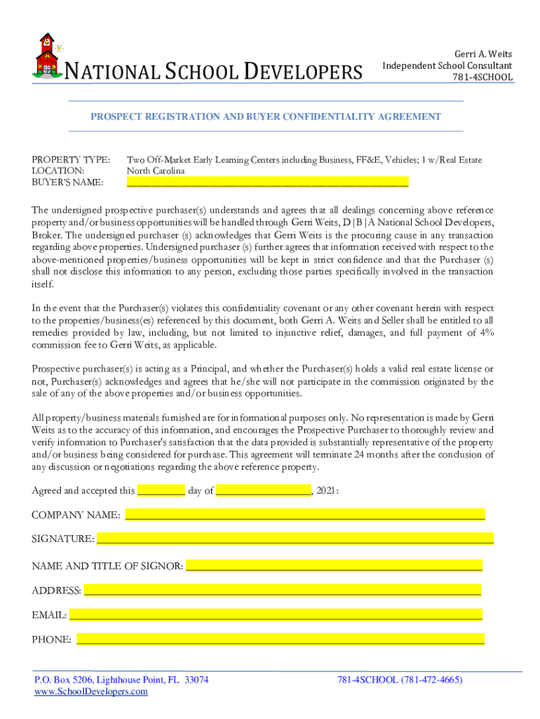 NATIONAL SCHOOL DEVELOPERSGerri A. Was Independent School Consultant 7814SCHOOLPROSPECT REGISTRATION AND BUYER CONFIDENTIALITY AGREEMENTPROPERTY TYPE: LOCATION: BUYERS NAME:Two Market Early Learning