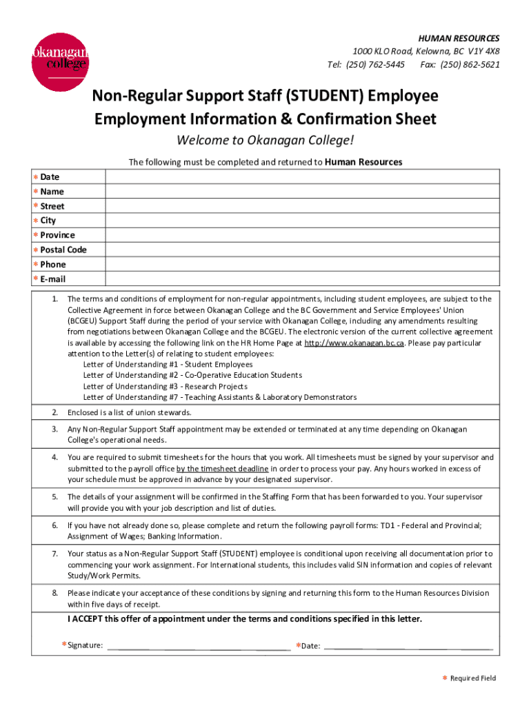 HUMAN RESOURCES 1000 KO Road, Kelowna, BC V1Y 4×8 Tel: (250) 7625445 Fax: (250) 8625621NonRegular Support Staff (STUDENT) Employee Employment Information & Confirmation Sheet Welcome to Flanagan