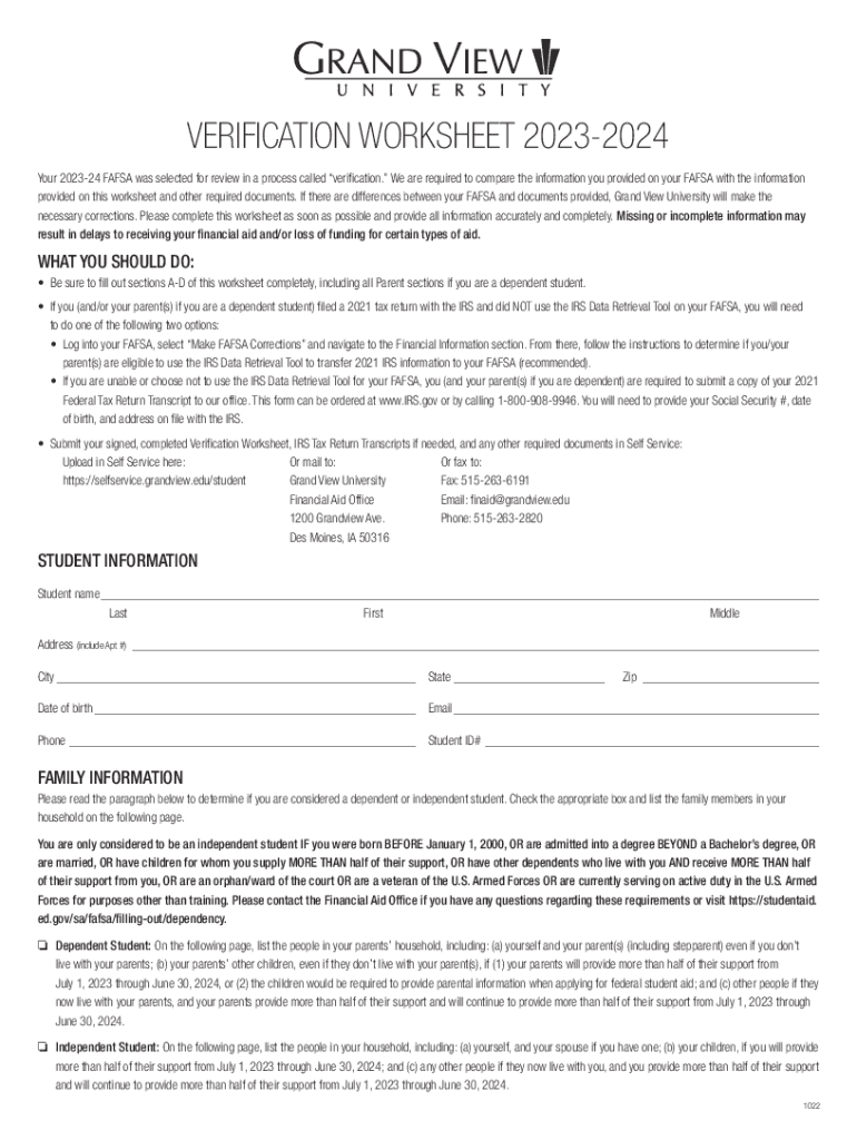 VERIFICATION WORKSHEET 20232024 Your 202324 FAFSA was selected for review in a process called verification. We are required to compare the information you provided on your FAFSA with the information