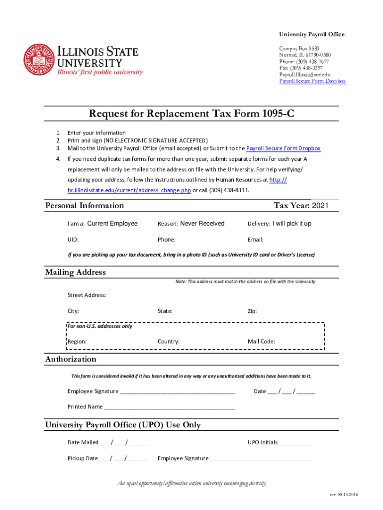 University Payroll Office Campus Box 0580 Normal, IL 617900580 Phone: (309) 4387677 Fax: (309) 4383357 Payroll.IllinoisState.edu Payroll Secure Form DropboxRequest for Replacement Tax Form 1095C 1.