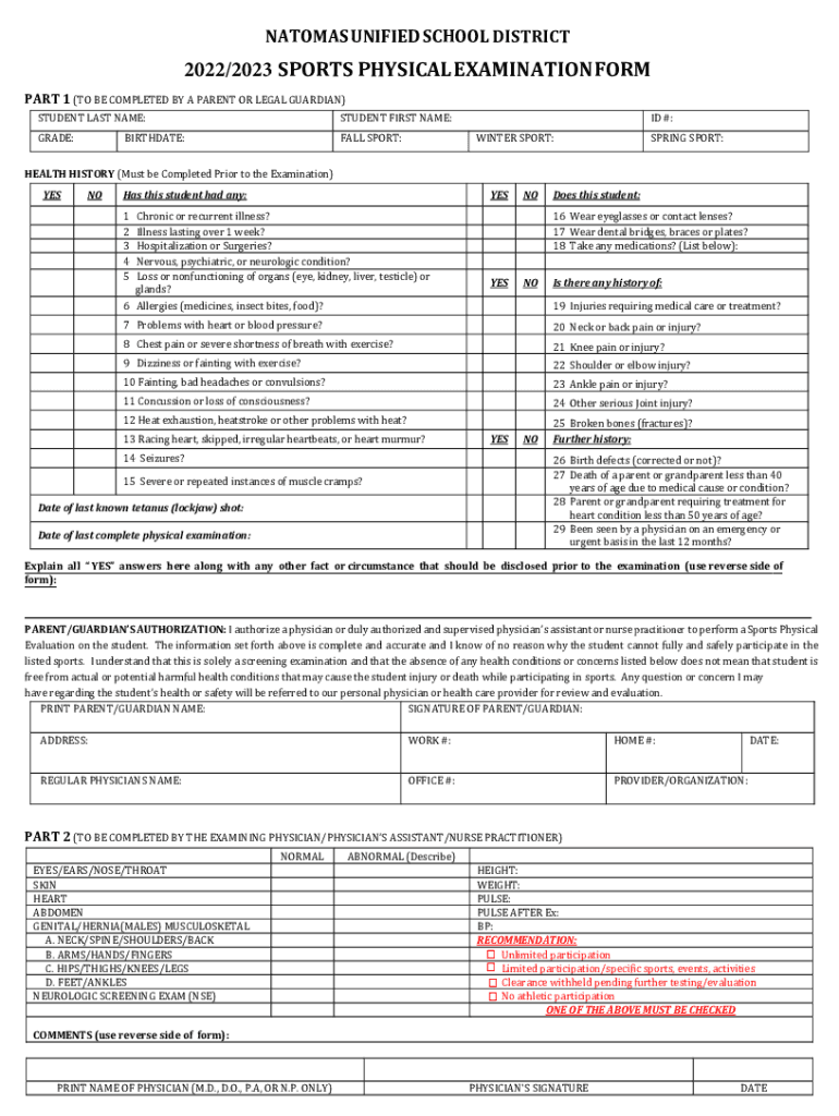 NATO MAS UNIFIED SCHOOL DISTRICT2022/2023 SPORTS PHYSICAL EXAMINATION FORM PART 1 (TO BE COMPLETED BY A PARENT OR LEGAL GUARDIAN) STUDENT LAST NAME:STUDENT FIRST NAME:GRADE:FALL SPORT:BIRTHDATE:ID