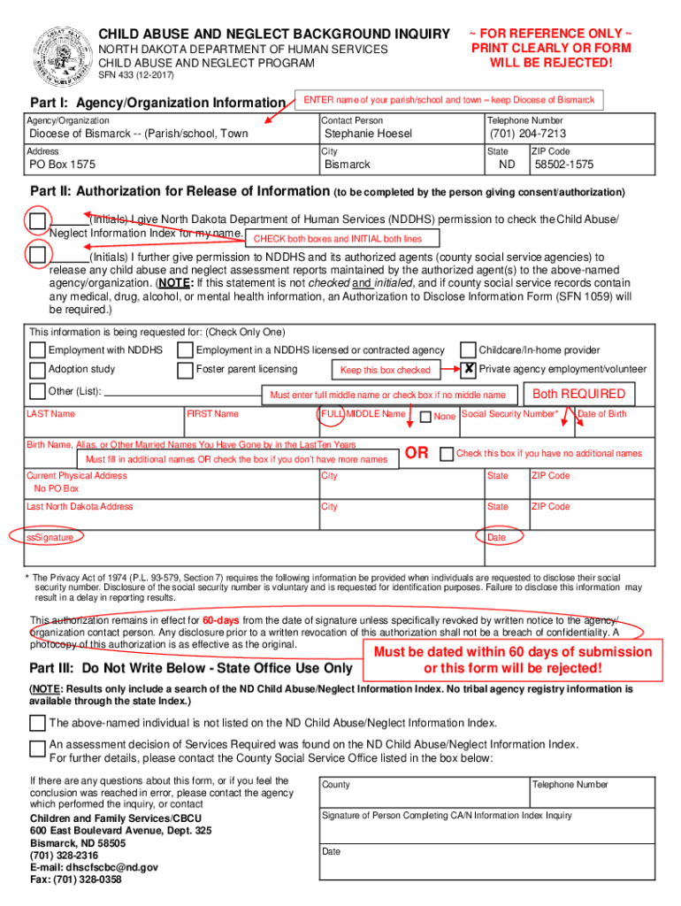 CHILD ABUSE AND NEGLECT BACKGROUND INQUIRY NORTH DAKOTA DEPARTMENT OF HUMAN SERVICES CHILD ABUSE AND NEGLECT PROGRAM FOR REFERENCE ONLY PRINT CLEARLY OR FORM WILL BE REJECTED!SON 433 (122017)Part