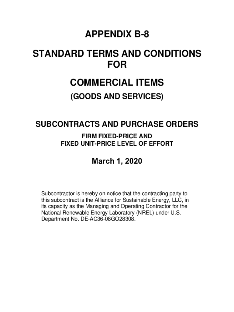 APPENDIX B8 STANDARD TERMS AND CONDITIONS FOR COMMERCIAL ITEMS (GOODS AND SERVICES)SUBCONTRACTS AND PURCHASE ORDERS FIRM FIXEDPRICE AND FIXED NITRIC LEVEL OF EFFORT March 1, 2020Subcontractor is hereby
