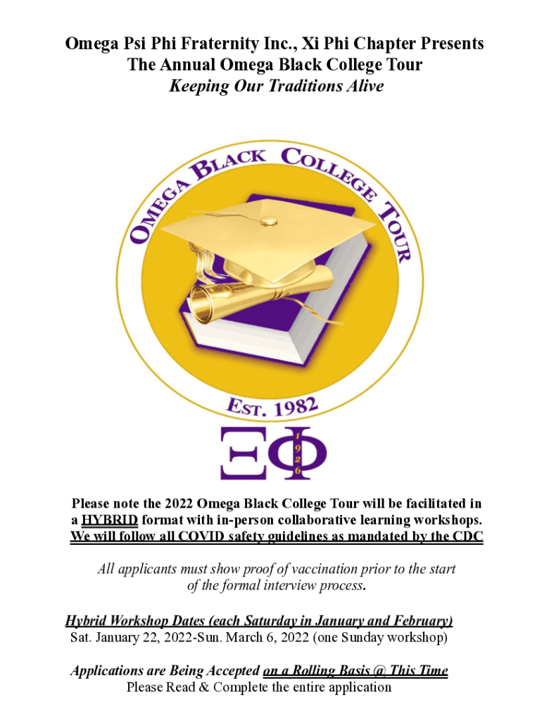 Omega Psi Phi Fraternity Inc., Xi Phi Chapter Presents The Annual Omega Black College Tour Keeping Our Traditions AlivePlease note the 2022 Omega Black College Tour will be facilitated in a HYBRID