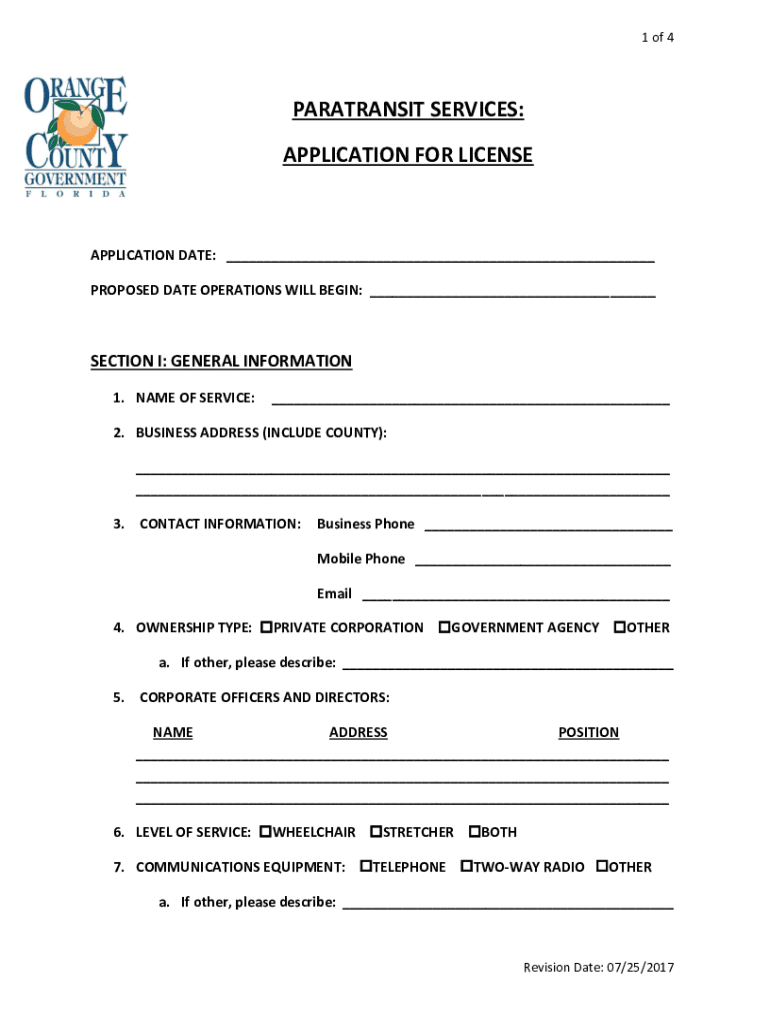 1 of 4PARATRANSIT SERVICES: APPLICATION FOR LICENSEAPPLICATION DATE: ___ PROPOSED DATE OPERATIONS WILL BEGIN: ___SECTION I: GENERAL INFORMATION 1. NAME OF SERVICE:___2. BUSINESS ADDRESS (INCLUDE COUNTY):___