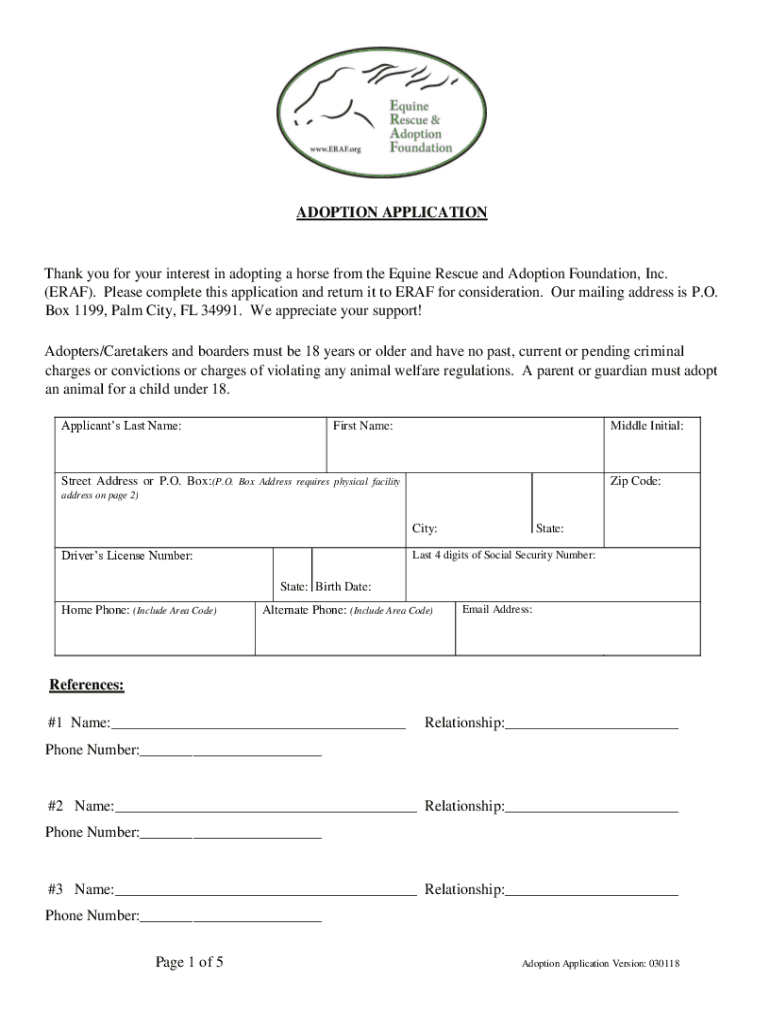 ADOPTION APPLICATIONThank you for your interest in adopting a horse from the Equine Rescue and Adoption Foundation, Inc. (ERA). Please complete this application and return it to ERA for consideration.
