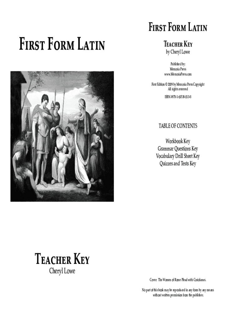 First Form LatinFirst Form Latin Teacher Key by Cheryl Republished by: Memorial Press www.MemoriaPress.com First Edition 2009 by Memorial Press Copyright All rights reserved ISBN #9781615380138TABLE