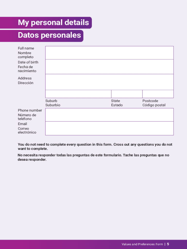 English / SpanishValues and Preferences Form
