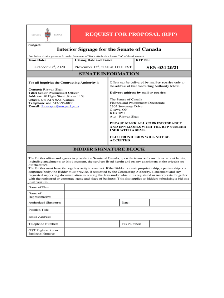 REQUEST FOR PROPOSAL (RFP) Subject:Interior Signage for the Senate of Canada For further details, please refer to the Statement of Work attached as Annex A of this document. Issue Date:October 23rd,