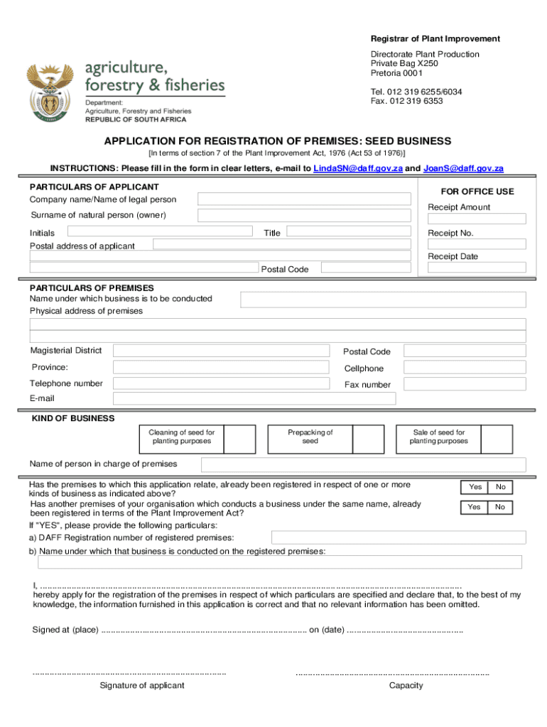 Fax. 012 319 6353APPLICATION FOR REGISTRATION OF PREMISES: SEED BUSINESS