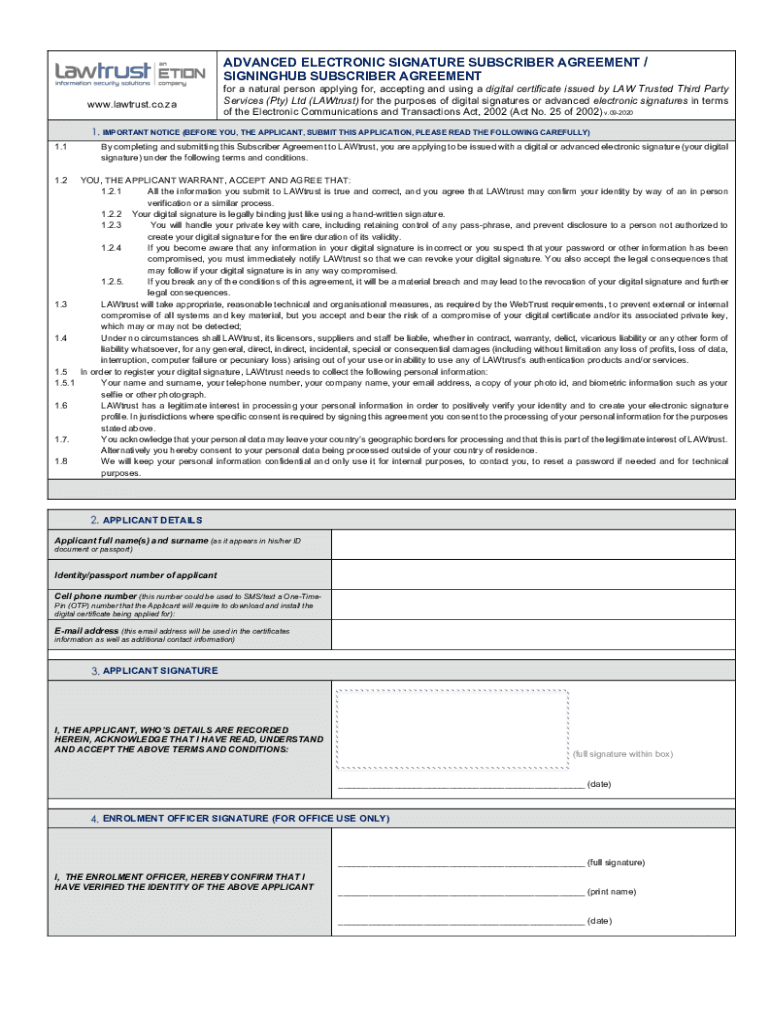 ADVANCED ELECTRONIC SIGNATURE SUBSCRIBER AGREEMENT / SIGNING SUBSCRIBER AGREEMENT www.lawtrust.co.zafor a natural person applying for, accepting and using a digital certificate issued by LAW Trusted