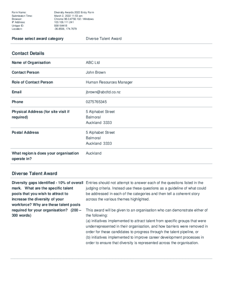 Form Name: Submission Time: Browser: IP Address: Unique ID: Location:Diversity Awards 2022 Entry Form March 2, 2022 11:53 am Chrome 98.0.4758.102 / Windows 103.106.111.241 936164418 36.8506, 174.7679Please