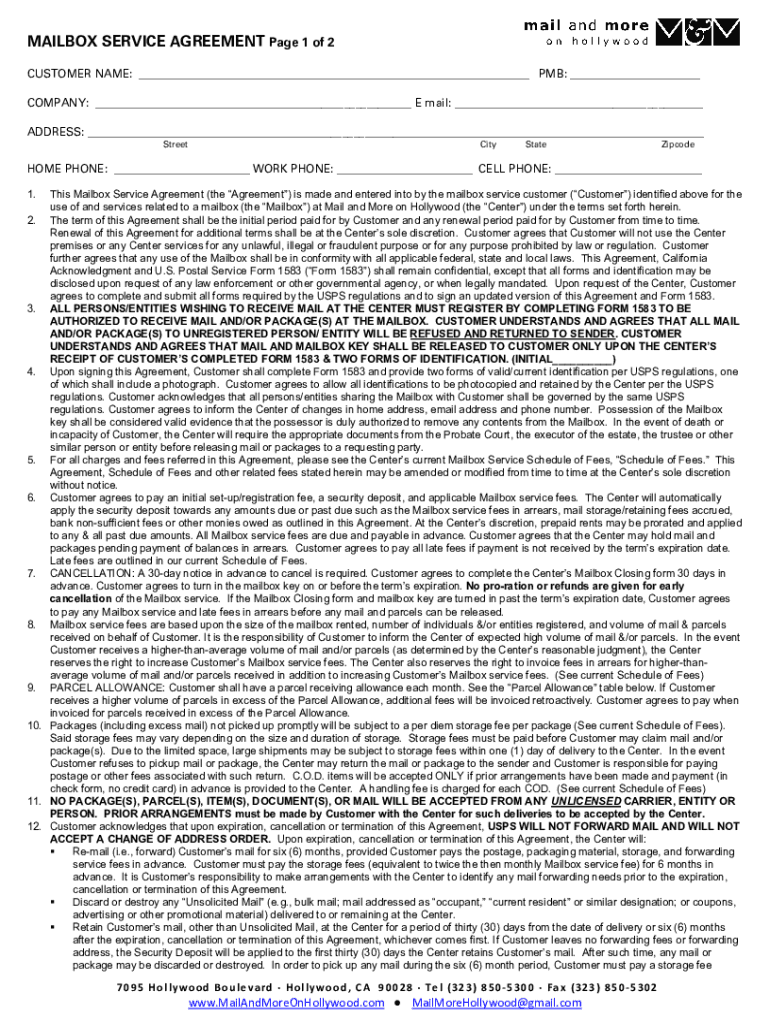 MAILBOX SERVICE AGREEMENT Page 1 of 2 CUSTOMER Names: ___ PMB: ___ COMPANY: ___ E mail: ___ ADDRESS: ___ StreetCityStateZipcodeHOME PHONE: ___ WORK PHONE: ___ CELL PHONE: ___ 1. This Mailbox Service