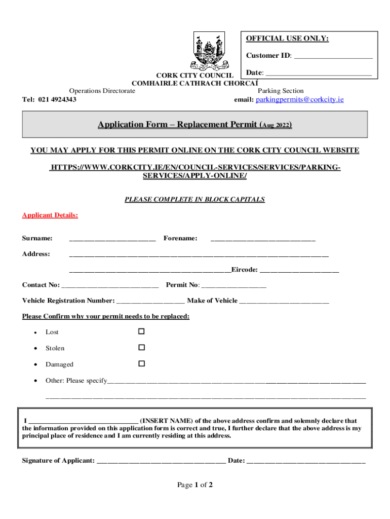 OFFICIAL USE ONLY: Customer ID: ___ Date: ___ CORK CITY COUNCIL COMPARE CATARACT CHOREA Operations Directorate Parking Section Tel: 021 4924343 email: parkingpermits@corkcity.ieApplication Form Replacement