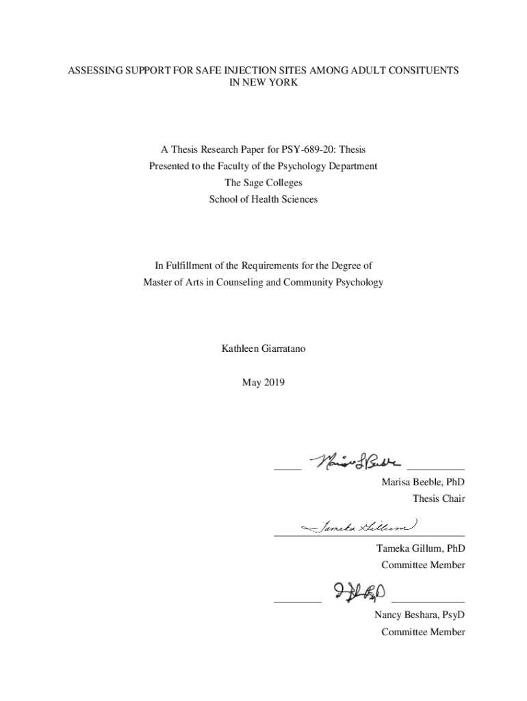 ASSESSING SUPPORT FOR SAFE INJECTION SITES AMONG ADULT CONSTITUENTS IN NEW YORK Thesis Research Paper for PSY68920: Thesis Presented to the Faculty of the Psychology Department The Sage Colleges School