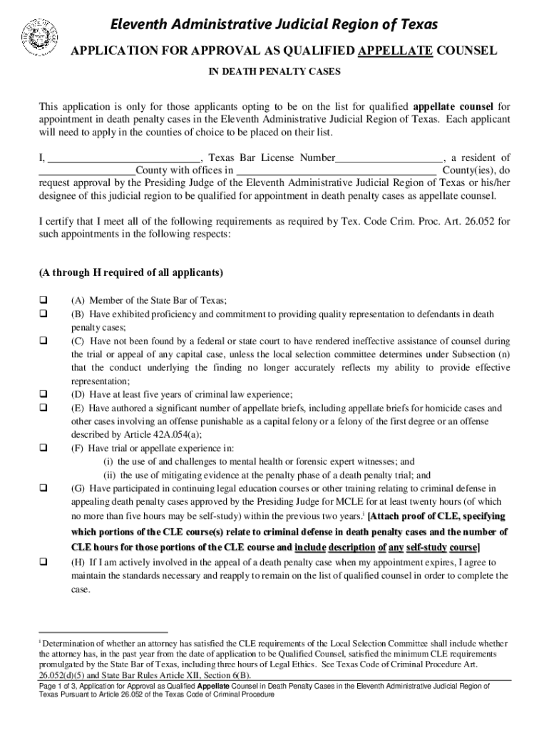 Eleventh Administrative Judicial Region of Texas APPLICATION FOR APPROVAL AS QUALIFIED APPELLATE COUNSEL IN DEATH PENALTY CASESThis application is only for those applicants opting to be on the list
