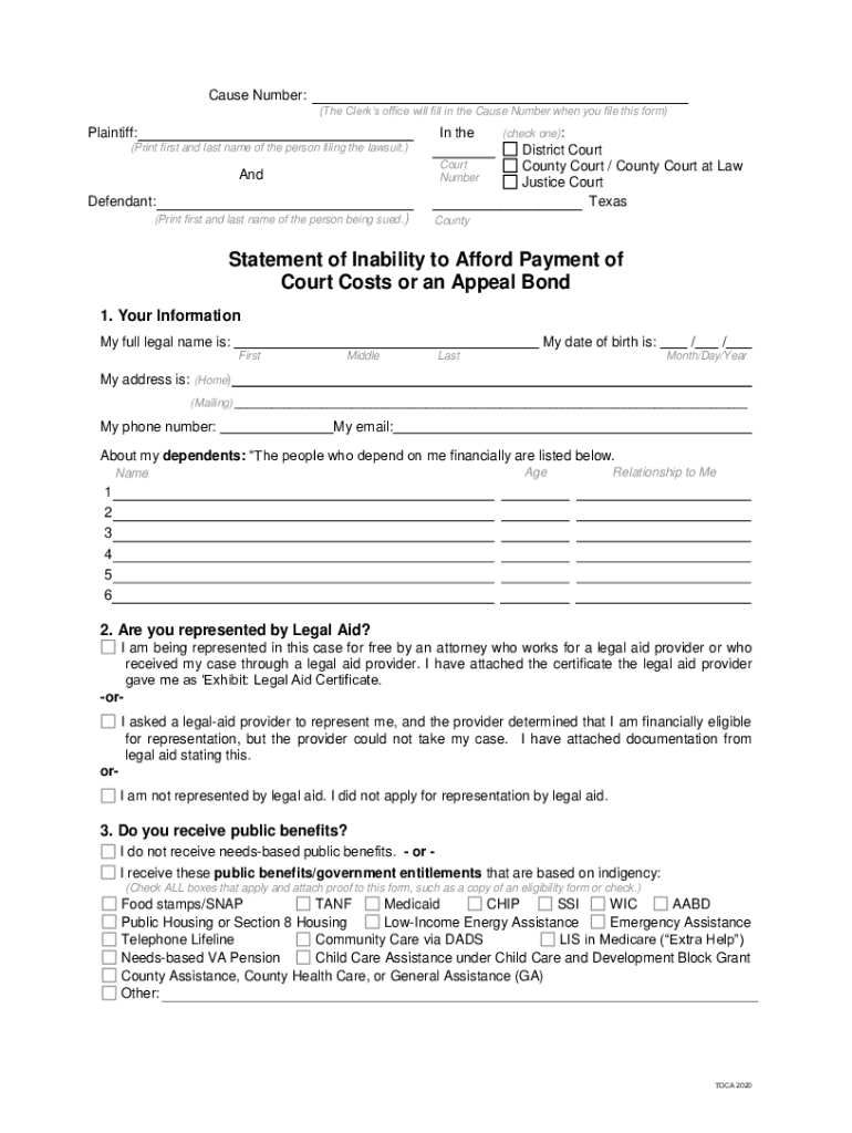 Get the free Affidavit of Inability to Pay Court costs - txcourts.gov
