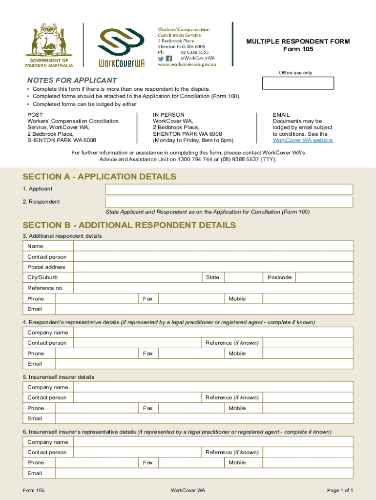 MULTIPLE RESPONDENT FORM 105Office use connotes FOR APPLICANT Complete this form if there is more than one respondent to the dispute. Completed forms should be attached to the Application for Conciliation