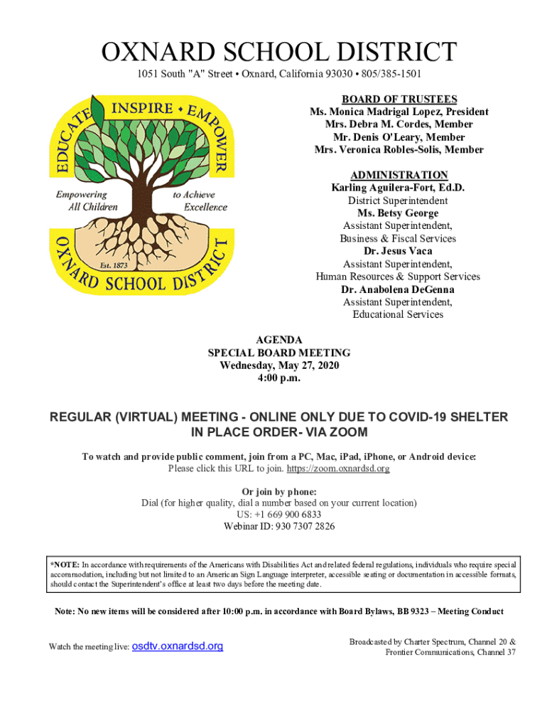 OXNARD SCHOOL DISTRICT 1051 South \” A\” Street Oxnard, California 93030 805/3851501 BOARD OF TRUSTEES Ms. Monica Madrigal Lopez, President Mrs. Debra M. Codes, Member Mr. Denis O\'Leary, Member