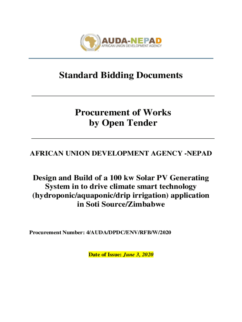 Standard Bidding DocumentsProcurement of Works by Open TenderAFRICAN UNION DEVELOPMENT AGENCY NEPADDesign and Build of a 100 kw Solar PV Generating System in to drive climate smart technology (hydroponic/aquaponic/drip