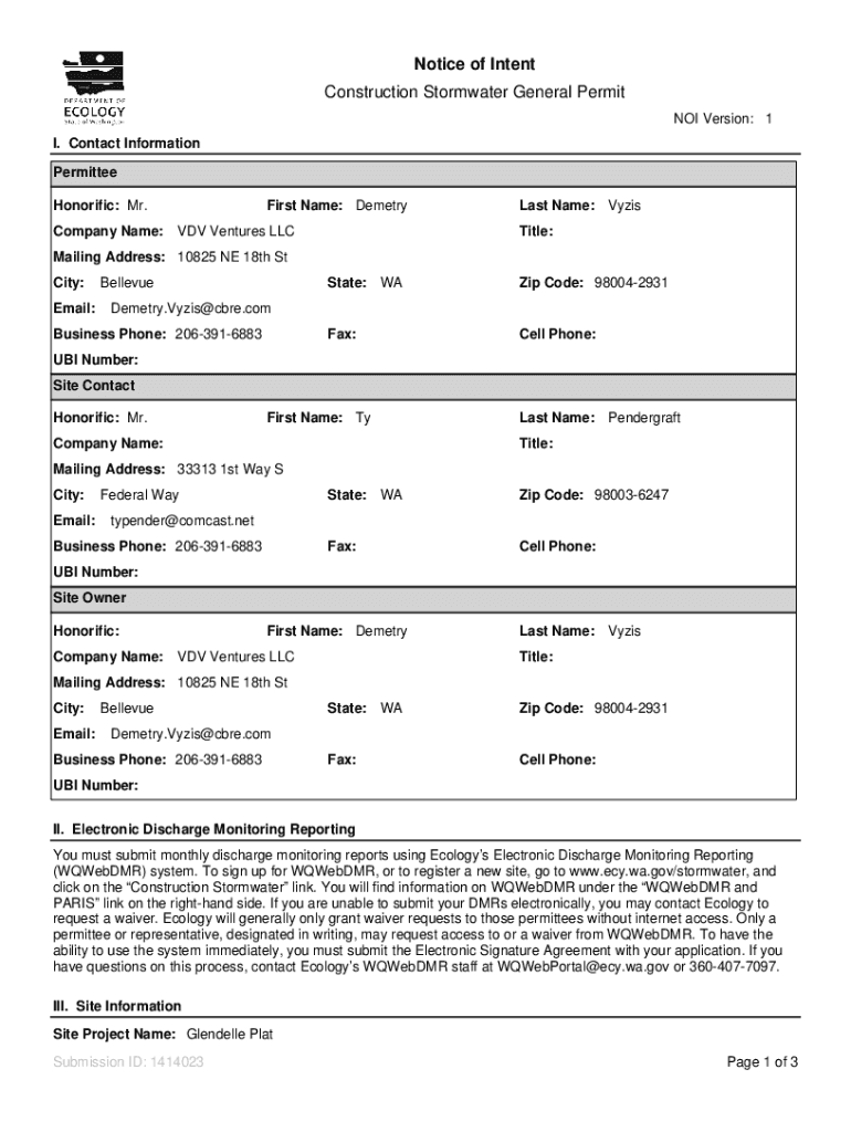 Notice of Intent Construction Stormwater General Permit NOI Version: 1 I. Contact Information Permitted Honorific: Mr. Company Name:First Name: Cemetery HDV Ventures Last Name: Nazis Title:Mailing