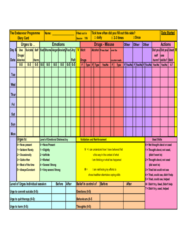 The Endeavor Program Diary Carnage: ___Urges to Drugs Masseuse Suicide Self Sad Shame Anger Anxiety Fear Joy Drugs/ Harm Date Alcohol Felt0505Y/NEmotionsDay &050505050505 05V IllicitAlcoholPrescribedDrugs