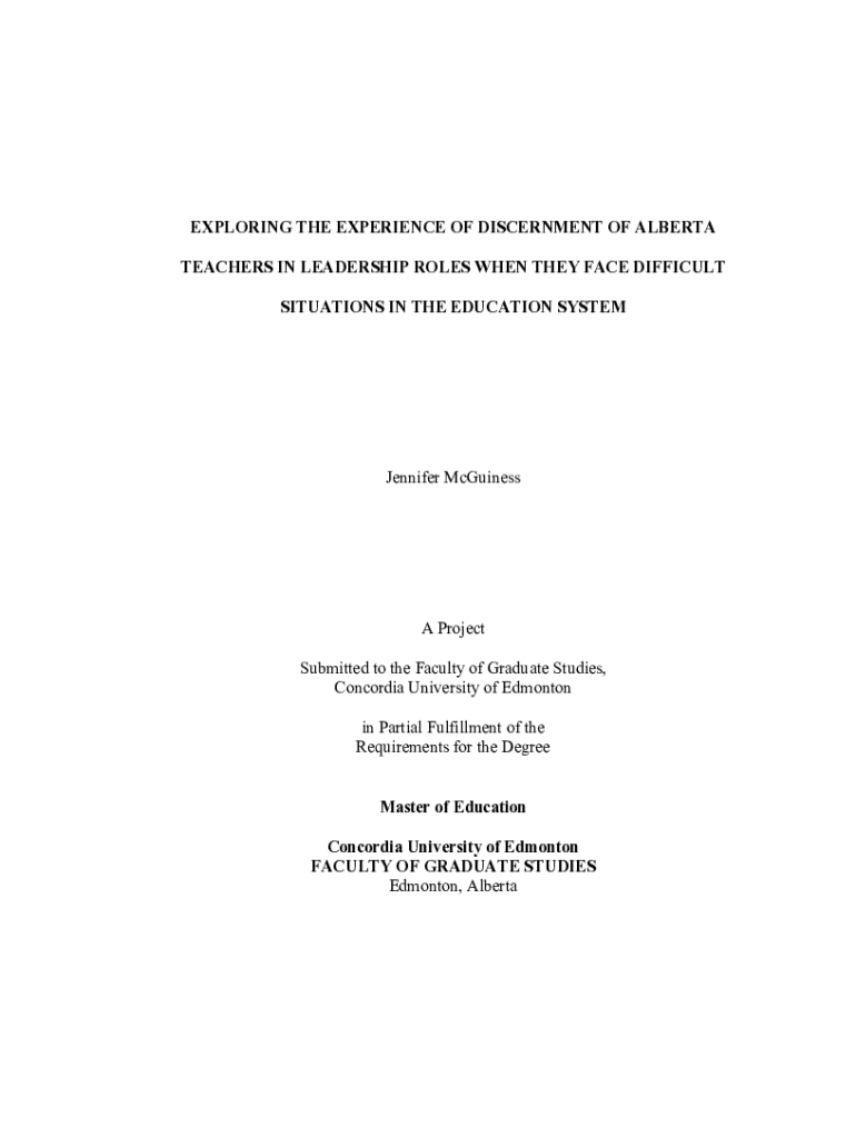 EXPLORING THE EXPERIENCE OF DISCERNMENT OF ALBERTA TEACHERS IN LEADERSHIP ROLES WHEN THEY FACE DIFFICULT SITUATIONS IN THE EDUCATION SYSTEM Jennifer Mugginess Project Submitted to the Faculty of Graduate