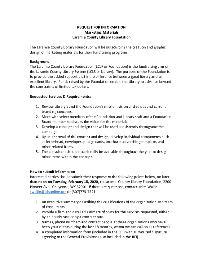REQUEST FOR INFORMATION Marketing Materials Laramie County Library Foundation The Laramie County Library Foundation will be outsourcing the creation and graphic design of marketing materials for their