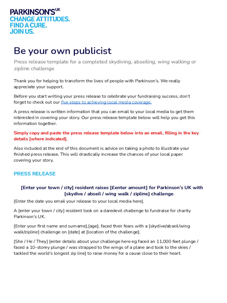 Be your own publicist Press release template for a completed skydiving, abseiling, wing walking or zip line challenge Thank you for helping to transform the lives of people with Parkinson's. We really