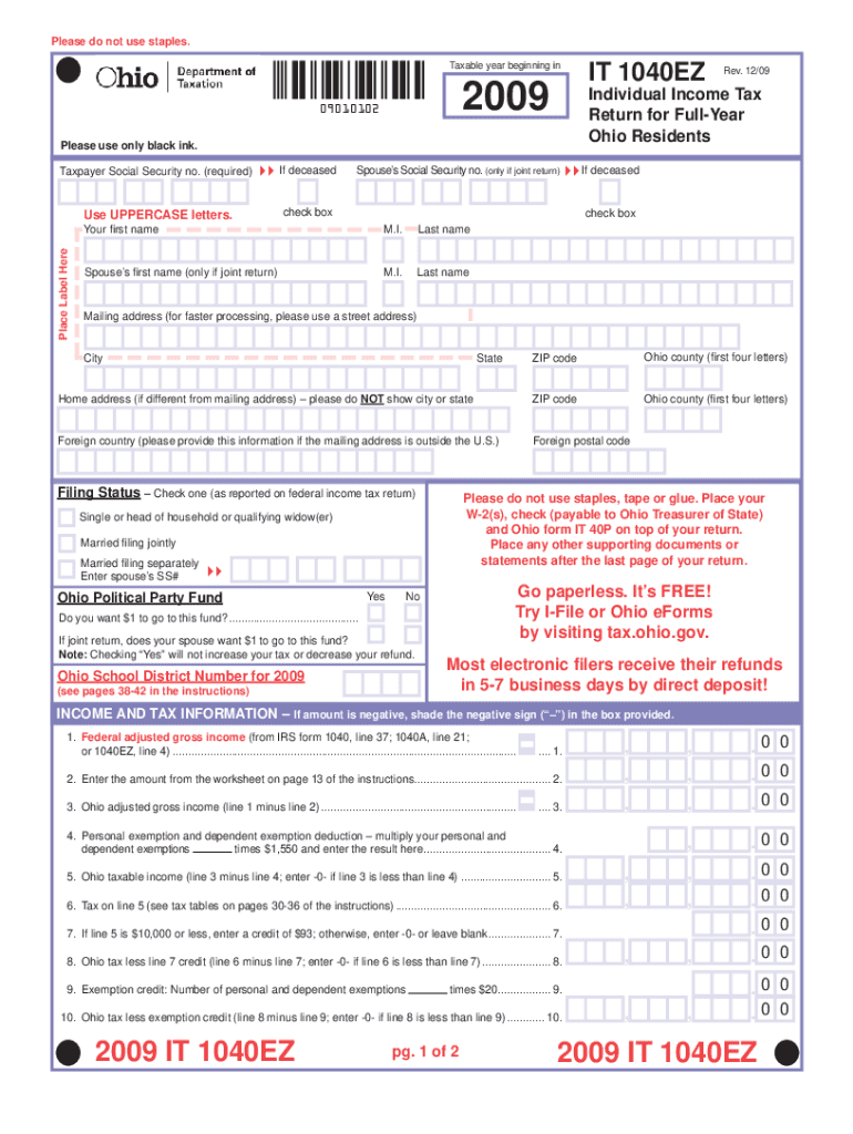 Please do not use staples. Taxable year beginning in200909010102Place Label Hearse UPPERCASE letters. Rev. 12/09Individual Income Tax Return for Full Year Ohio ResidentsPlease use only black ink.