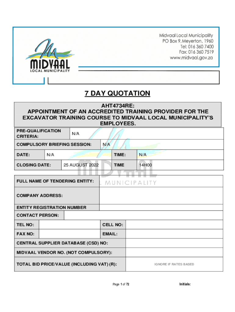 7 DAY QUOTATION AHT4734RE: APPOINTMENT OF AN ACCREDITED TRAINING PROVIDER FOR THE EXCAVATOR TRAINING COURSE TO MIDVALE LOCAL MUNICIPALITY EMPLOYEES. PREQUALIFICATION CRITERIA:N/COMPULSORY BRIEFING