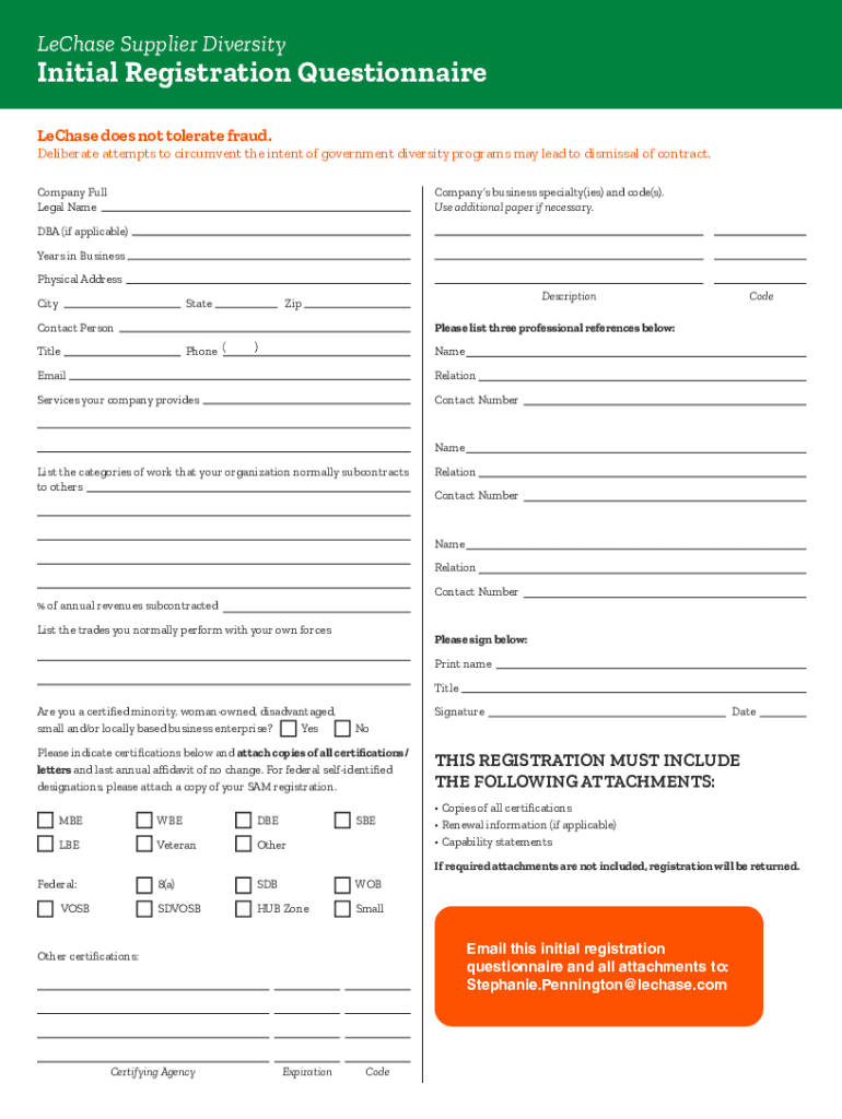 Le Chase Supplier DiversityInitial Registration Questionnaire Le Chase does not tolerate fraud. Deliberate attempts to circumvent the intent of government diversity programs may lead to dismissal
