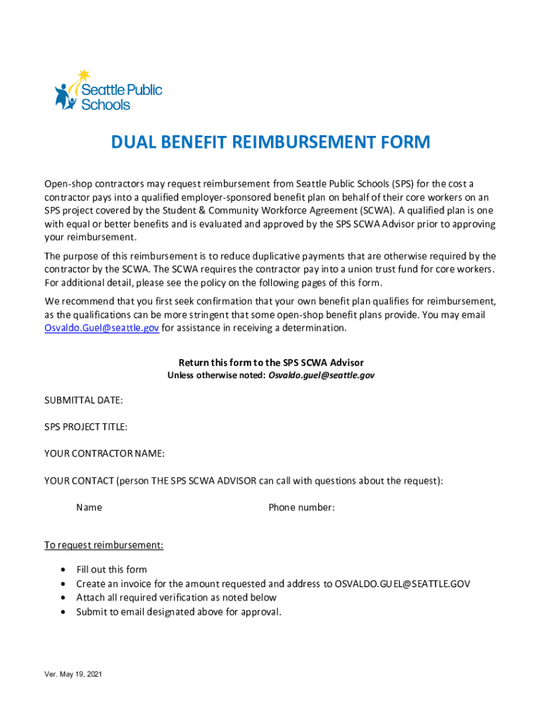 DUAL BENEFIT REIMBURSEMENT FORM Open shop contractors may request reimbursement from Seattle Public Schools (SPS) for the cost a contractor pays into a qualified employer sponsored benefit plan on