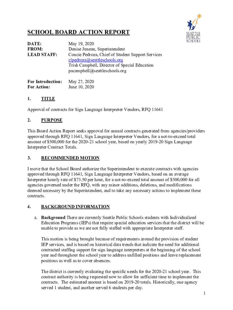 SCHOOL BOARD ACTION REPORT DATE: FROM: LEAD STAFF:May 19, 2020, Denise Juneau, Superintendent Concise Pedro, Chief of Student Support Services clpedroza@seattleschools.org Trish Campbell, Director