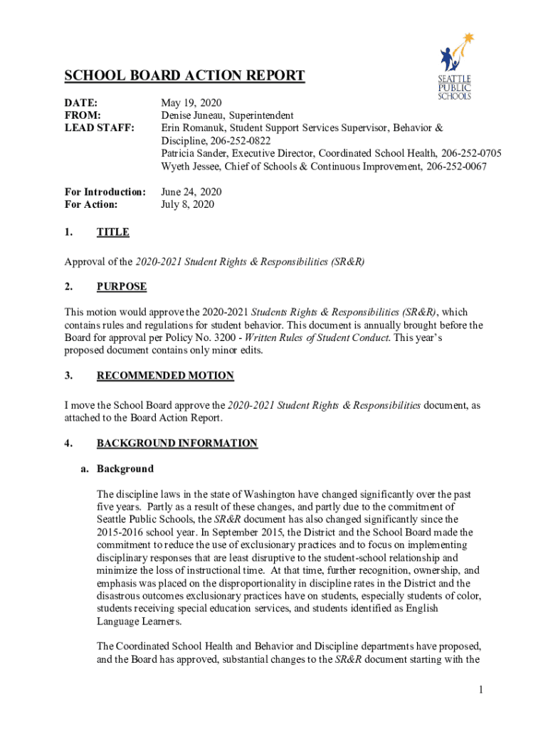 SCHOOL BOARD ACTION REPORT DATE: FROM: LEAD STAFF:May 19, 2020, Denise Juneau, Superintendent Erin Roman, Student Support Services Supervisor, Behavior & Discipline, 2062520822 Patricia Sander, Executive