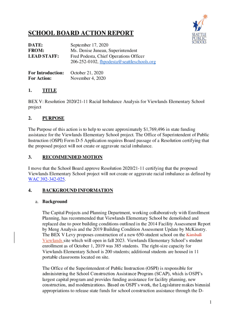 SCHOOL BOARD ACTION REPORT DATE: FROM: LEAD STAFF:September 17, 2020, Ms. Denise Juneau, Superintendent Fred Modest, Chief Operations Officer 2062520102, fhpodesta@seattleschools.orgFor Introduction: