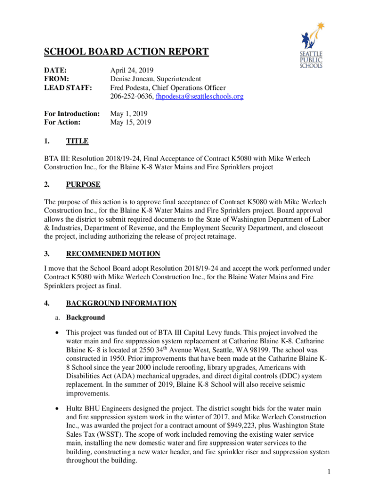 SCHOOL BOARD ACTION REPORT DATE: FROM: LEAD STAFF:April 24, 2019, Denise Juneau, Superintendent Fred Modest, Chief Operations Officer 2062520636, fhpodesta@seattleschools.orgFor Introduction: For