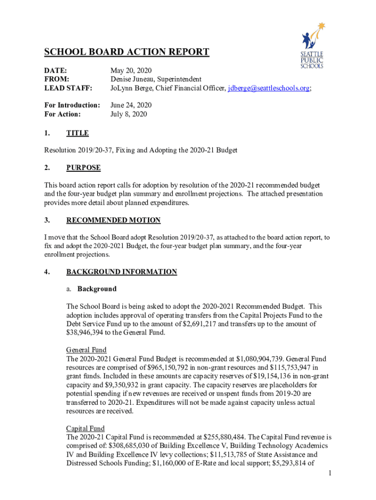 SCHOOL BOARD ACTION REPORT DATE: FROM: LEAD STAFF:May 20, 2020, Denise Juneau, Superintendent Jo Lynn Merge, Chief Financial Officer, jdberge@seattleschools.org;For Introduction: For Action:June 24,
