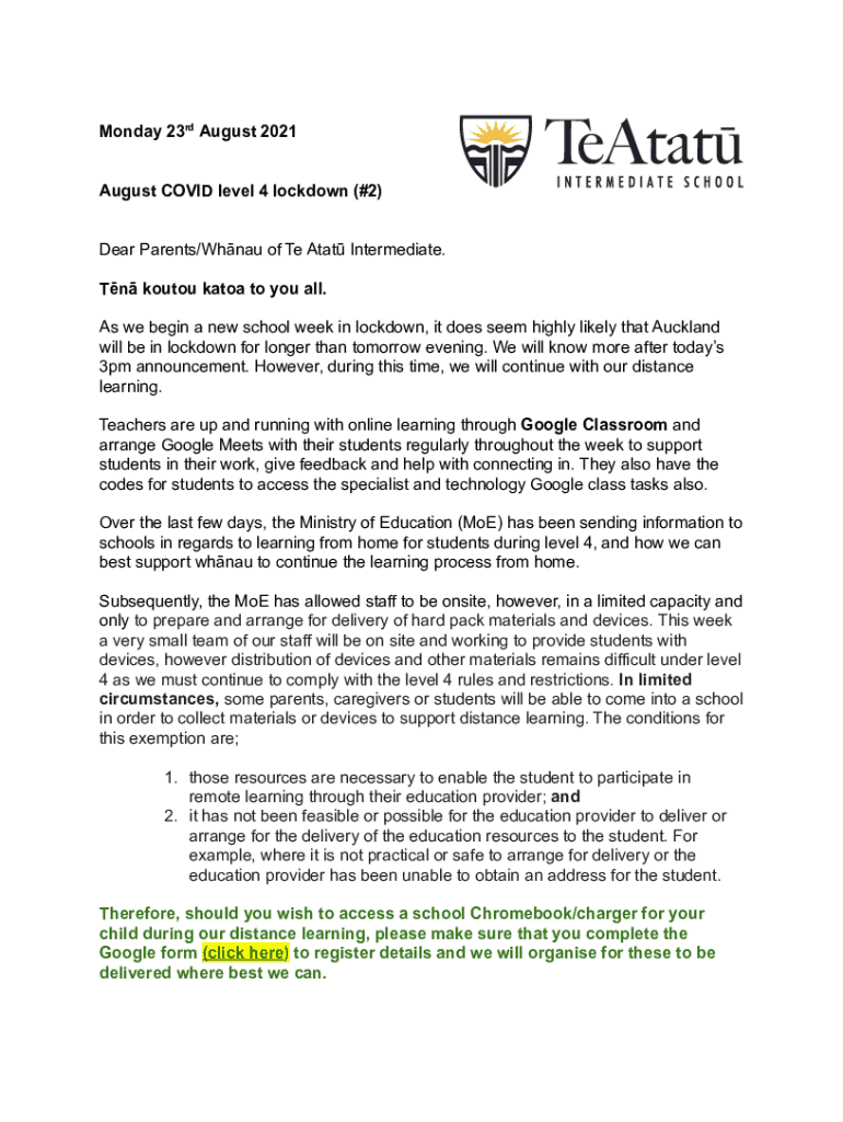 Monday 23rd August 2021 August COVID-19 level 4 lockdown (#2) Dear Parents/What of Te Stat Intermediate. Tn Mouton Katia to you all. As we begin a new school week in lockdown, it does seem highly