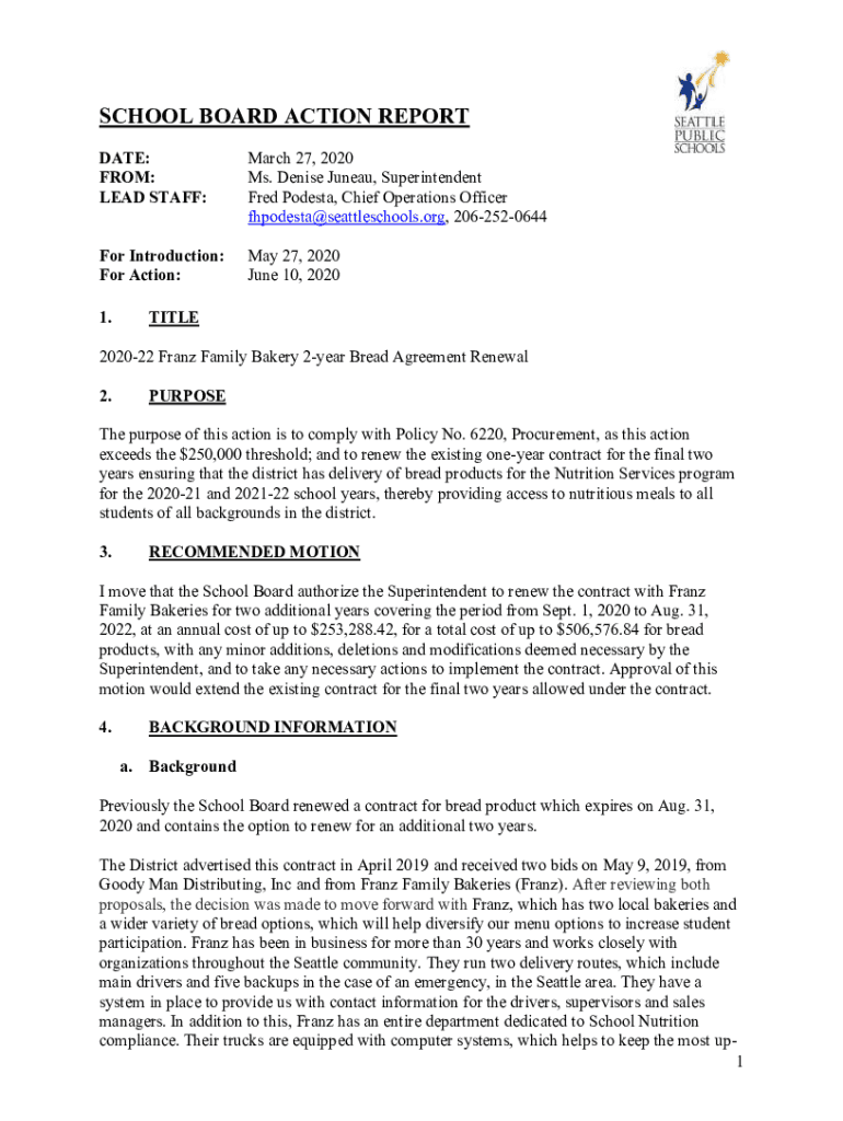 SCHOOL BOARD ACTION REPORT DATE: FROM: LEAD STAFF:March 27, 2020, Ms. Denise Juneau, Superintendent Fred Modest, Chief Operations Officer fhpodesta@seattleschools.org, 2062520644For Introduction: