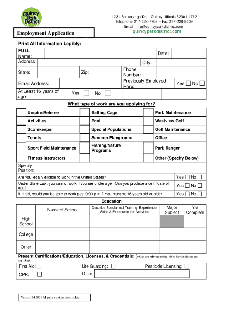 1231 Bonansinga Dr. Quincy, Illinois 623011762 Telephone 2172237703 Fax 2172289209 Email info@quincyparkdistrict.comquincyparkdistrict.comEmployment Application Print All Information Legibly: FULL
