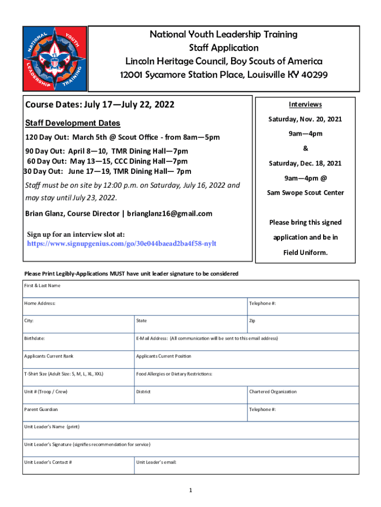 National Youth Leadership Training Staff Application Lincoln Heritage Council, Boy Scouts of America 12001 Sycamore Station Place, Louisville KY 40299 Course Dates: July 17July 22, 2022Interviews