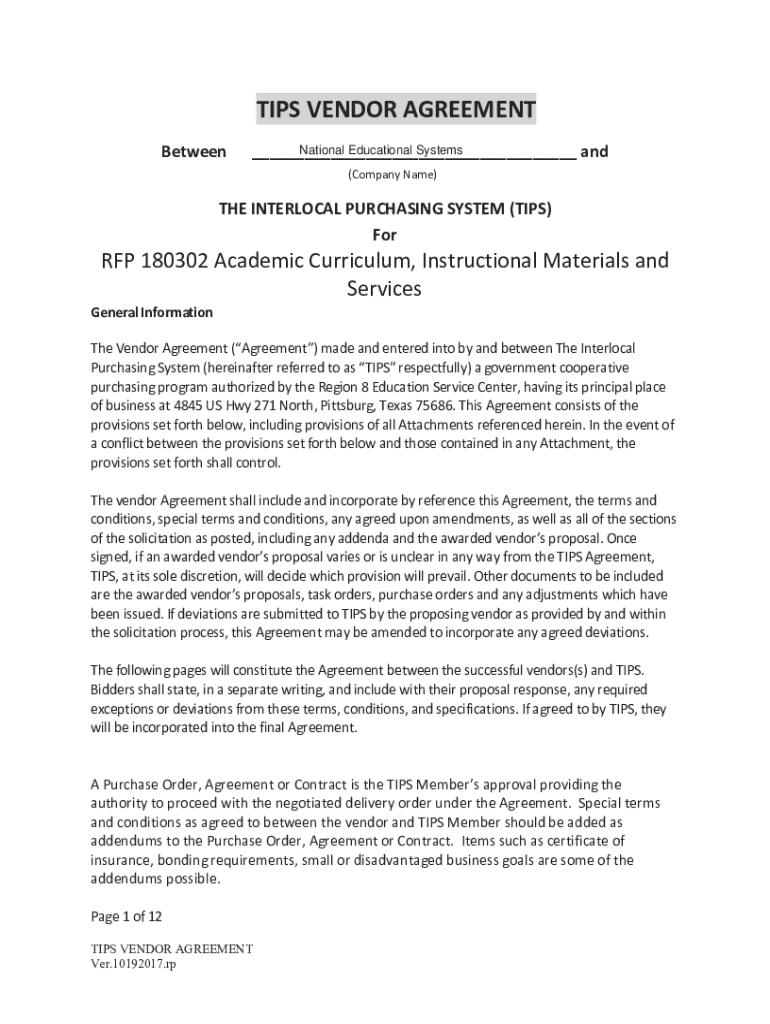 TIPS VENDOR AGREEMENT BetweenNational Educational Systems ___ and(Company Name)THE INTERLOCK PURCHASING SYSTEM (TIPS) For RFP 180302 Academic Curriculum, Instructional Materials and Services General