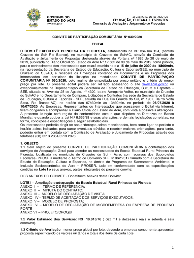 Comics de Avaliao e Judgment de PropostasCONVITE DE PARTICIPATE COMMUNITARIAN N 030/2020 /2020EDITAL OC OMIT EXECUTIVE PRINCES ADA FOREST, FOREST estabelecido Na BR 364 km 124, (Santino Cruzado do