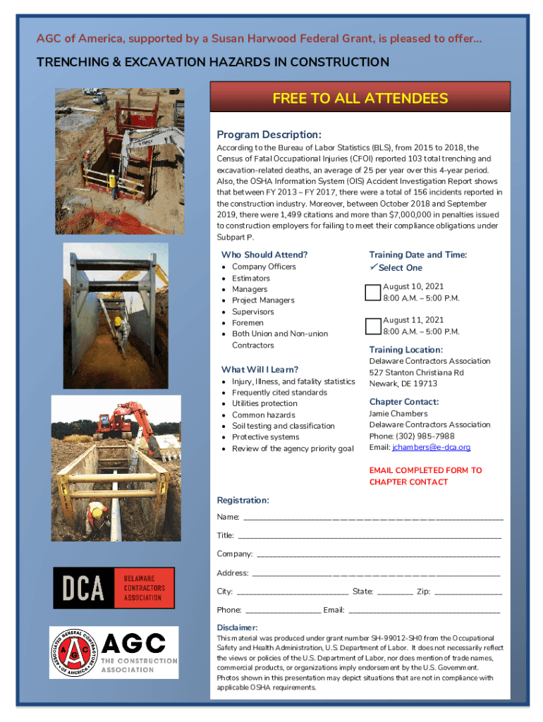 AGC of America, supported by a Susan Hardwood Federal Grant, is pleased to offerTRENCHING & EXCAVATION HAZARDS IN CONSTRUCTIONFREE TO ALL ATTENDEES Program Description: According to the Bureau of