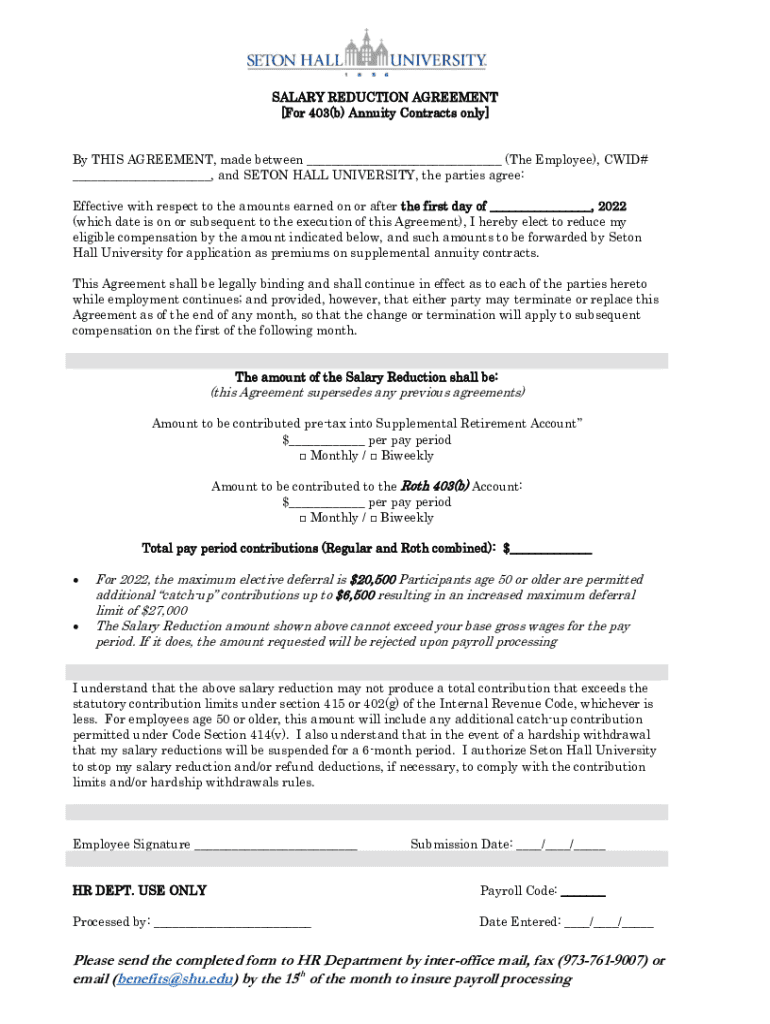SALARY REDUCTION AGREEMENT [For 403(b) Annuity Contracts only] By THIS AGREEMENT, made between ___ (The Employee), CID# ___, and SETON HALL UNIVERSITY, the parties agree: Effective with respect to